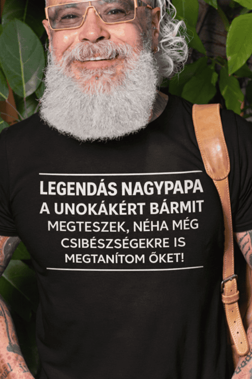 A felirat: „LEGENDÁS NAGYPAPA A UNOKÁKÉRT BÁRMIT MEGTESZEK, NÉHA MÉG CSIBÉSZSÉGEKRE IS MEGTANÍTOM ŐKET!”
