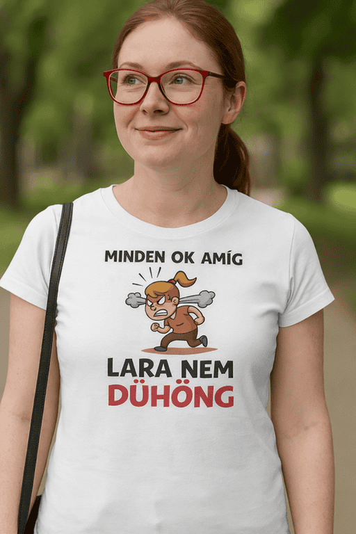 Van az a pillantás, amikor a levegő hirtelen „feszültebb” lesz… 😈 Ez a női póló a „MINDEN OK AMÍG LARA NEM DÜHÖNG” felirattal pontosan azt üzeni, amit mindenki gondol, csak nem meri kimondani.