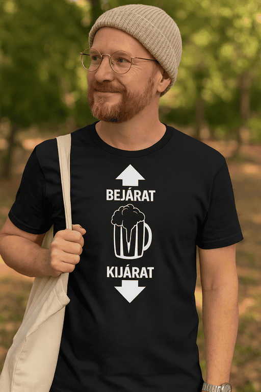 🍺 A sör útja egyszerű: bejárat… és kijárat! A „BEJÁRAT KIJÁRAT” felirat és a korsó ikon nyíllal pontosan azt mondja, amit mindenki gondol – csak sokkal viccesebben.