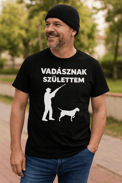 Ha hív a természet (és a kutyád), stílusosan válaszolsz. 🐾 A fekete póló „Vadásznak születtem” felirattal egyértelmű üzenet minden erdőjárónak! 😄