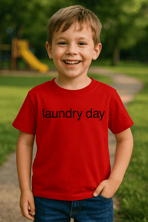 🧺 A ‘laundry day’ megérkezett – ez a piros póló EXTRA NEVETÉS programot kapcsol a kicsinél! 😄 A piros, rövid ujjú póló fekete nyomattal egyértelműen jelzi, hogy ma forog a dob és pörög a jókedv. Tökéletes a kis ‘segédeknek’, akik szívesen ‘segítenek’ a mosásban, és a szülőknek, akiknek jól jön egy kis nevetés a szennyeshalmok között.