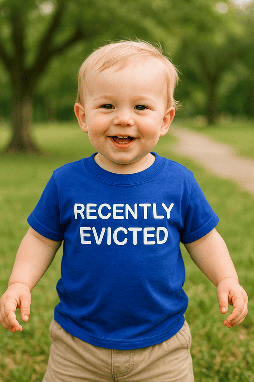🤣 Vége a hasbérleti szerződésnek! A kék póló fehér RECENTLY EVICTED felirattal mindent elmond helyetted. Amikor a kis hős hivatalosan megérkezik a színpadra, kell egy egyenruha a nagy debütáláshoz.