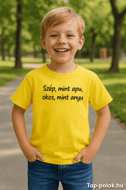 Ha vicces gyerek póló ajándék után kutatsz, ami egyetlen mondattal képes megnevettetni a rokonokat és a barátokat, ez telitalálat. A „Szép, mint apu, okos, mint anyu” felirat pont annyira vagány, hogy mindenki mosolyogjon, de még pont annyira aranyos, hogy ne lehessen nem szeretni. 😉