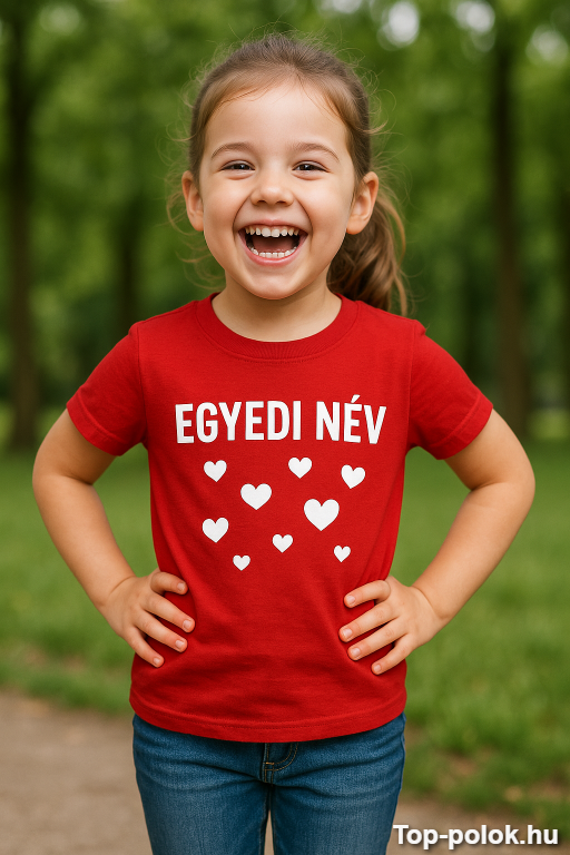 Ez a „Szívecskés [egyedi név]” gyerek póló pont azt tudja, amit egy jó vicces póló ajándék: azonnal beszédtémát csinál a viselőjéből. Cuki, de van benne egy csipet vagányság is — mert miért ne legyen a név is sztár? 💖