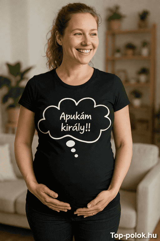 Kismama póló ajándék, ami egy mondattal helyre teszi a rangsort: „Apukám király!!” 😄 Tökéletes, ha a pocaklakó már most üzenne apának – jó hangosan.