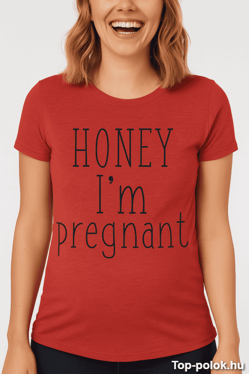 Ez a kismama póló terhes bejelentéshez készült, amikor már nem bírod magadban tartani, de szeretnéd stílusosan (és kicsit csípősen) tálalni: „Honey I’m pregnant” 😄