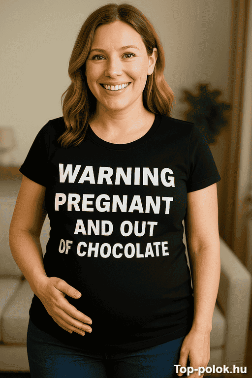Van az a pillanat, amikor a kismama nem kér sokat… csak csokit. És ha épp nincs? Na, erre született a „Warning pregnant and out of chocolate” felirat – egy egyértelmű, imádnivalóan pimasz figyelmeztetés. 🍫