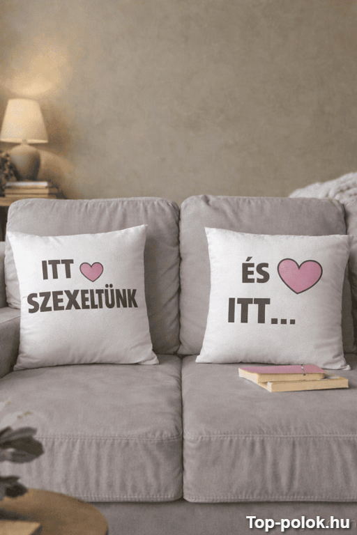 Egy páros párna, ami kimondja helyetted: ITT SZEXELTÜNK / ÉS ❤ ITT… 😄 Ha közös poénotok van a hálószobáról (vagy a kanapéról), ez lesz a legviccesebb „jelölőtábla”.