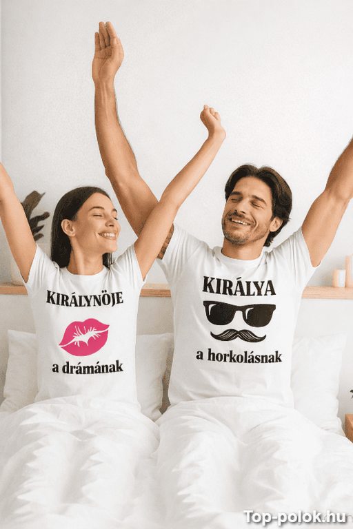 Ha olyan vicces páros póló ajándék kell, ami egyszerre cukin csipkelődős és azonnal poénra veszi a kapcsolatotokat, ez telitalálat. A feliratokkal mindenki érteni fogja a dinamikát: „A horkolás királya” kontra „A dráma királynője” – és igen, ez így együtt működik. 😂