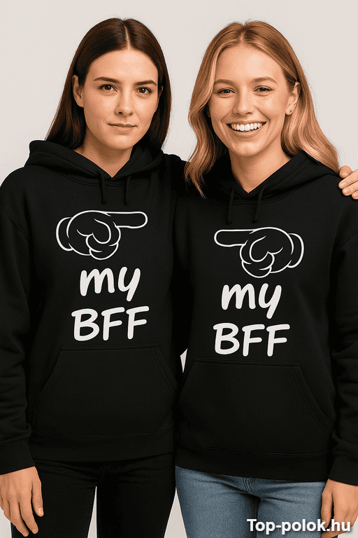 Ha olyan vicces páros pulóver ajándék kell, ami nem nyálas, mégis nagyon is „mi együtt” vibe, akkor a „my BFF” felirat telitalálat. Egyetlen szó, és máris mindenki érti, ki kinek a kedvence. 😉