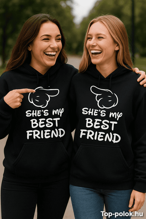 Ez a páros pulóver best friend felirattal nem finomkodik: SHE’S MY BEST FRIEND. Pont az a kicsit pimasz, mégis cuki üzenet, amitől mindenki azonnal érti, ki az, akivel egy pillantásból is tudjátok, mire gondol a másik. 😉