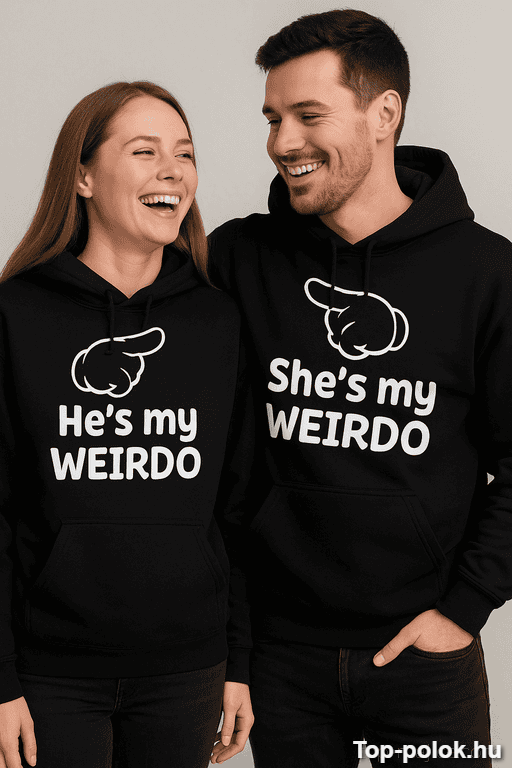 Ha olyan ajándékot keresel, ami nem nyálas, mégis romantikus, ez a páros pulóver weirdo ajándék telitalálat. A „She’s my weirdo” és „He’s my weirdo” üzenet egyértelmű: összetartoztok, és imádjátok egymás bolondos oldalát. 😉
