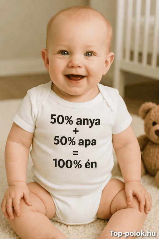 A vicces baba body ajándék kategóriában ez a darab igazi telitalálat: „50% anya + 50% apa = 100% én” – és kész, le is van vezetve a családi matek 😄 A poén azonnal átjön, még annak is, aki fél a százalékoktól.