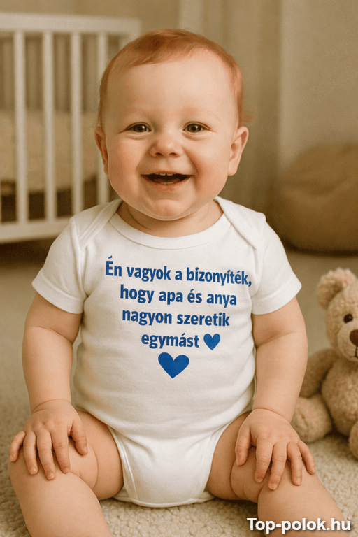 Ha olyan vicces baba body ajándék kell, ami egyszerre cuki és pimaszul őszinte, meg is van: „Én vagyok a bizonyíték, hogy apa és anya nagyon szeretik egymást ❤”. Egyetlen mondat, és máris indul a nevetés – főleg a rokonoknál.