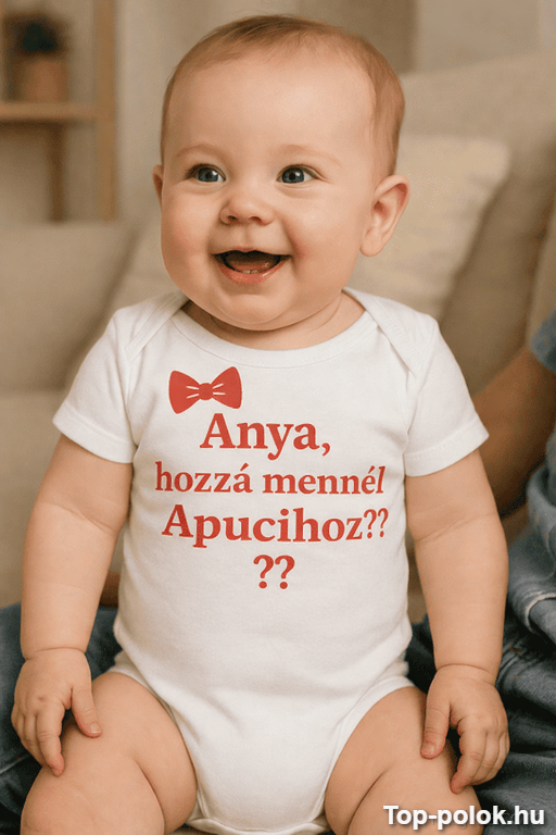 Ha olyan vicces baba body ajándék kell, ami egyszerre csípős és cuki, ez telitalálat: „Anya, hozzá mennél Apucihoz??” – és máris kész a mini „kérő” a családban. 😄