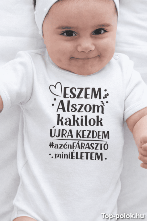 Ha olyan vicces baba body ajándék kell, ami egyetlen mondatban összefoglalja a babás mindennapok valóságát, meg is van: „ESZEM Alszom kakilok ÚJRA KEZDEM #azénFÁRASZTÓ miniÉLETEM”. A poén azonnal ül, a fotók pedig garantáltan emlékezetesek lesznek. 📸