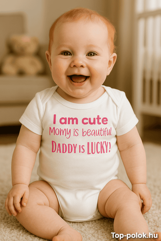 Ez a vicces baba body ajándék nem finomkodik: a kicsi kimondja, amit mindenki gondol. „I am cute Momy is beautiful DADDY is LUCKY!” – és kész, a családi legenda megszületett 😄