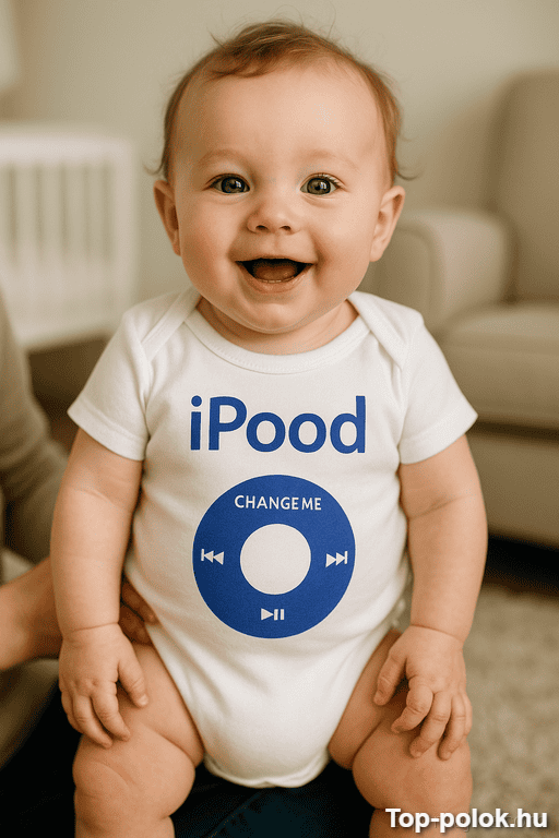 A vicces baba body iPood felirattal egyetlen üzenetet küld: ez a mini „kütyü” már most menőbb, mint bárki a családban. A poén egyszerű, azonnal érthető, és pont ezért üt nagyot. 😄