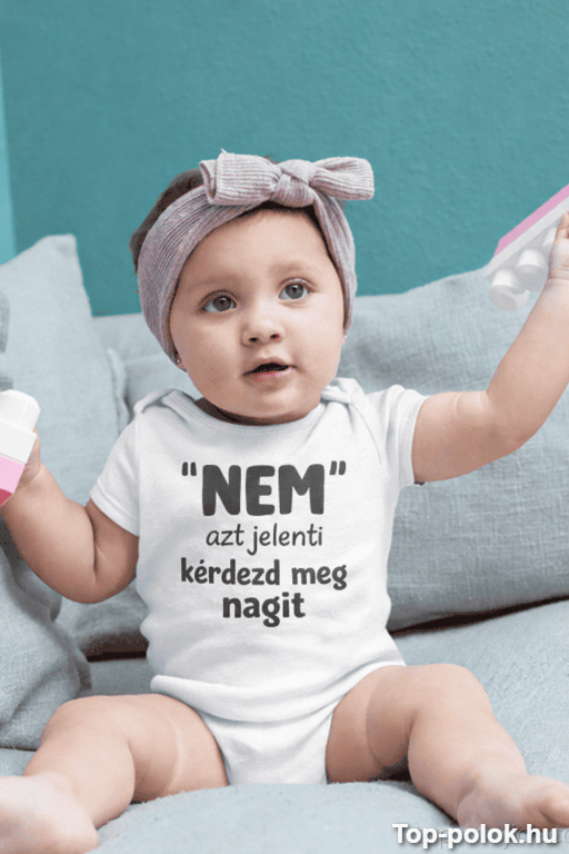 Ez a vicces baba body ajándék azoknak a kicsiknek készült, akik már most tudják, hogyan kell „tárgyalni” a felnőttekkel. A felirat („Nem” azt jelenti kérdezd meg nagit) egy pimaszul aranyos üzenet, amitől mindenki érteni fogja a helyzetet első pillantásra. 😄