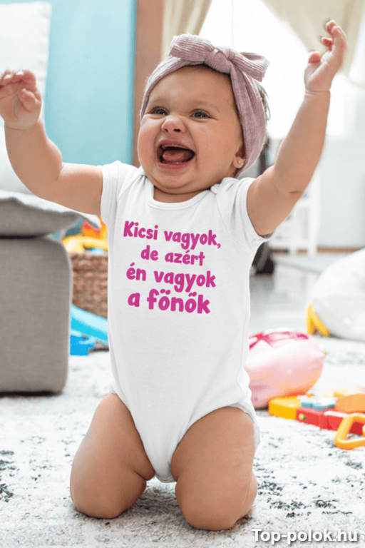 Ha olyan vicces baba body ajándékot keresel, ami már az első pillantásra mosolyt csal mindenki arcára, megtaláltad. A felirat („Kicsi vagyok, de azért én vagyok a főnök”) pont azt mondja ki, amit mindenki sejt: itt bizony a legkisebb dirigál. 😄