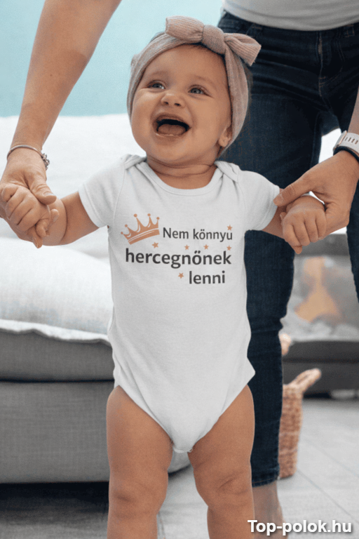 A vicces baba body hercegnő felirata („Nem könnyű hercegnőnek lenni”) az a mondat, amit a pici valószínűleg még nem tud kimondani… de mindenki látja rajta. 😄 Egy apró, mókás üzenet, ami azonnal feldobja a hangulatot és viszi a show-t.