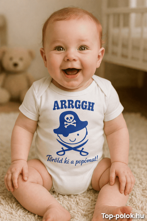 Ez a vicces baba body kalóz stílusban pont azt mondja ki, amit minden pelenkázásnál gondolsz: „ARRGGH / Töröld ki a popómat!” 😄 Egyetlen pillanat alatt feldobja a napot, és garantáltan beszédtémát csinál a legártatlanabb helyzetből is.