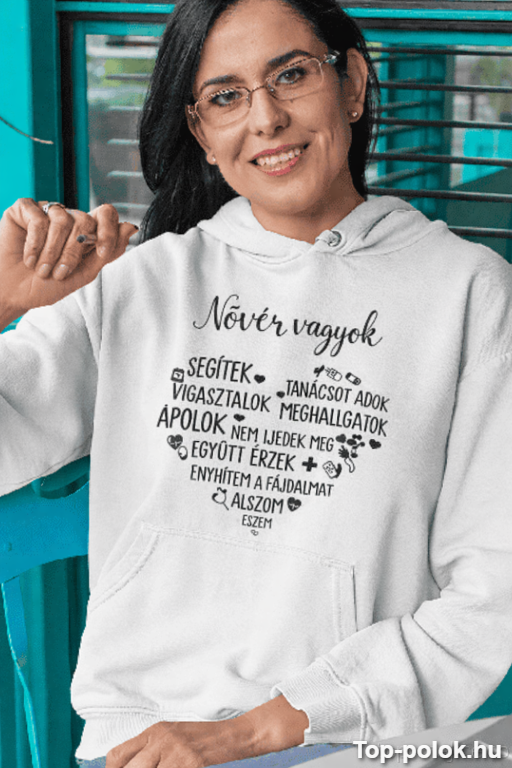 Ha kell egy ajándék, ami első pillantásra megnevettet, de közben tiszteleg is a hivatás előtt, ez a vicces kapucnis pulóver nővér ajándék telitalálat. A felirat sorra veszi mindazt, amit mindenki tud a nővérekről: segítenek, vigasztalnak, tanácsot adnak, nem ijednek meg… és igen, néha alszanak és esznek is. 😉