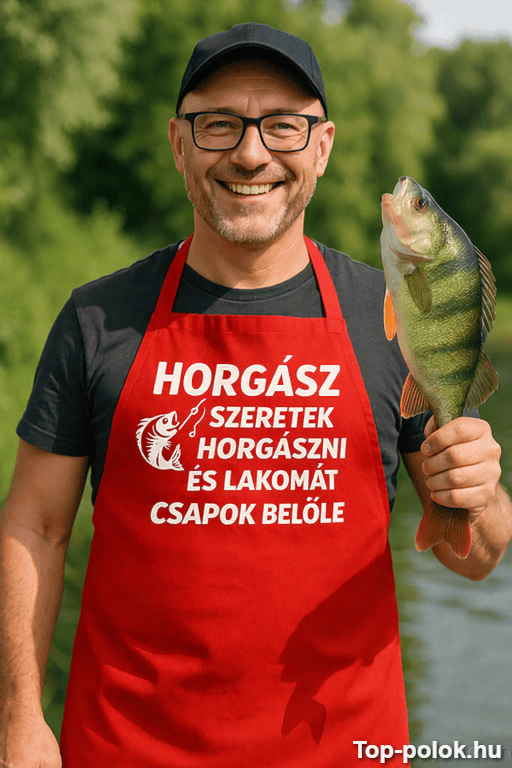 A vicces kötény horgász ajándék kategória nagyágyúja: „Horgász szeretek horgászni és lakomát csapok belőle”. Ha a pecázás nála vallás, a halfogás meg ünnep, ezzel garantált a röhögés. 😄
