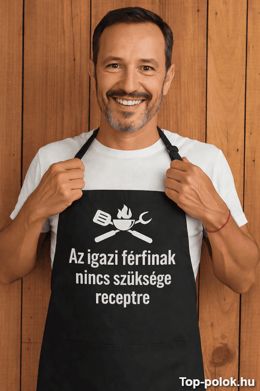 Ha olyan ajándékot keresel, ami egyszerre poénos és telitalálat, ez a vicces kötény ajándék pont az. A felirat („Az igazi férfinak nincs szüksége receptre”) finoman pimasz, és garantáltan megindítja a nevetést a konyhában. 😄