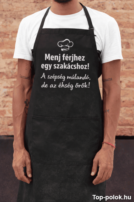 Ha olyan vicces kötény ajándék kell, ami egyetlen mondattal feldobja a főzést, megtaláltad. A felirat pont annyira pimasz, amennyire kell: „Menj férjhez egy szakácshoz! A szépség múlandó, de az éhség örök!” 😂