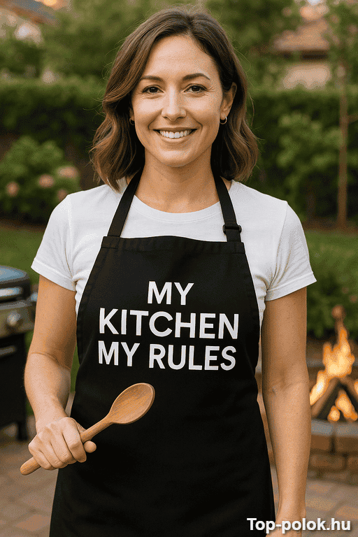 Ez a „My kitchen my rules” kötény egyetlen mondattal rendet tesz: itt bizony a szakács diktál. 😄 Ha valaki imád főzni, de közben szereti kiosztani a „segítő” kezeket is, ez az ő stílusa.