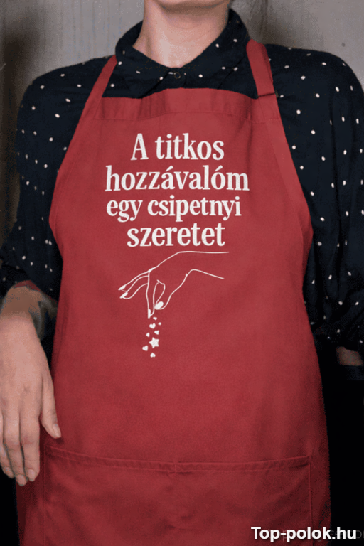 Ha kell egy poén, ami már az első keverésnél megnevettet, ez a kötény telitalálat: „A titkos hozzávalóm egy csipetnyi szeretet”. Mert igen, lehet, hogy a recept egyszerű… de a hangulatod legendás. 😉