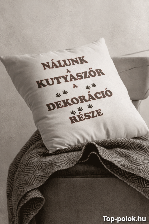 Ez a vicces párna kutyaszőr témában azoknak szól, akiknél a négylábú a család része… és a szőr is mindenhol ott van. A felirat („NÁLUNK A KUTYASZŐR A DEKORÁCIÓ RÉSZE”) egyetlen mondattal elintézi a magyarázkodást – és közben baromi vicces. 🐶