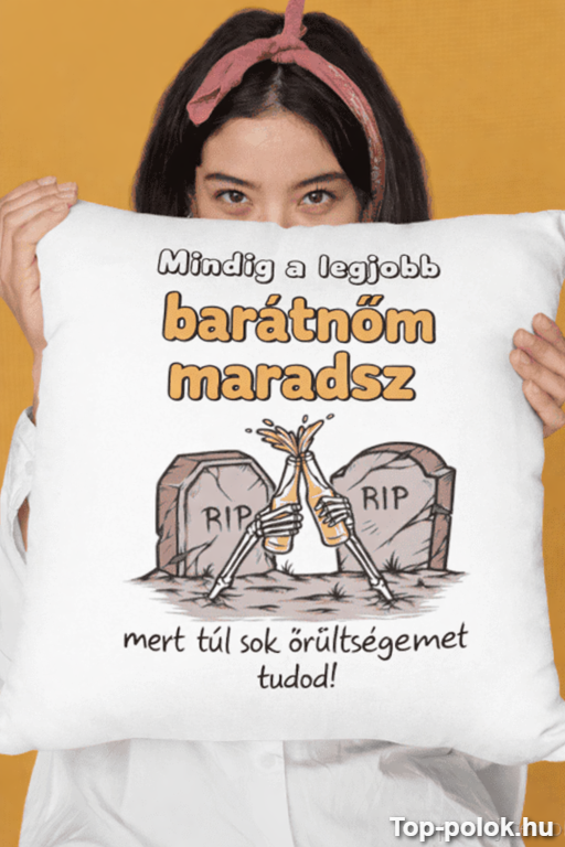 Ha olyan vicces párna barátnő ajándék kell, ami nem csak cuki, hanem pimaszul őszinte is, akkor megvan. A felirat: „Mindig a legjobb barátnőm maradsz, mert túl sok őrültségemet tudod!” – és ettől az egész azonnal belsős poénná válik. 😏