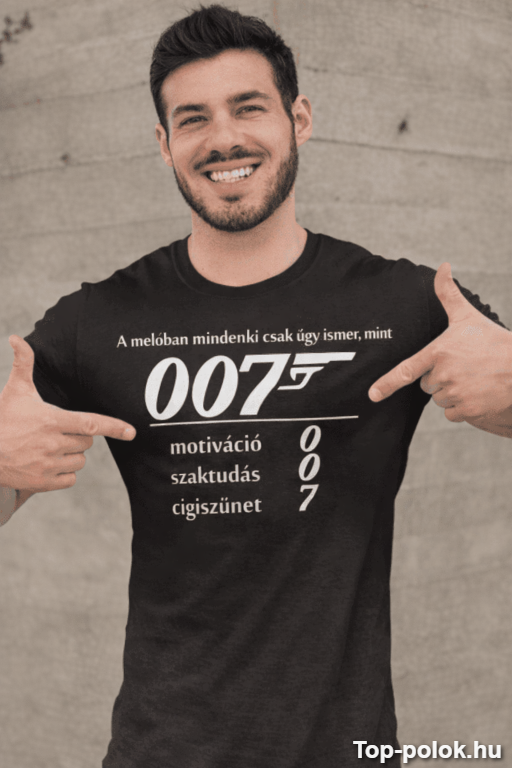 A vicces póló 007 a melóban tökéletesen kimondja azt, amit mindenki gondol: „A melóban mindenki csak úgy ismer, mint 007 – motiváció 0, szaktudás 0, cigiszünet 7.” Ez a poén azonnal átmegy, és garantáltan hozza a kuncogást a kávéautomata környékén. 😎
