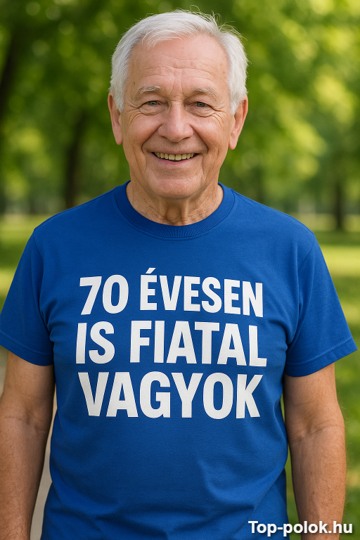 A 70 évesen is fiatal vagyok póló egy üzenet: a kor csak szám, a lendület meg hozzáállás. A felirat („70 évesen is fiatal vagyok”) pont annyira pimasz, hogy mindenki mosolyogjon, de közben büszkén is viselhető 😉