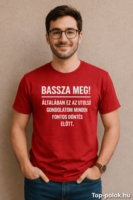 Van az a pillanat, amikor komolynak kellene lenni… aztán megszületik az utolsó gondolat: „Bassza meg! Általában ez az utolsó gondolatom minden fontos döntés előtt.” Ez a felirat pont azt mondja ki, amit sokan csak magukban mernek. 😅