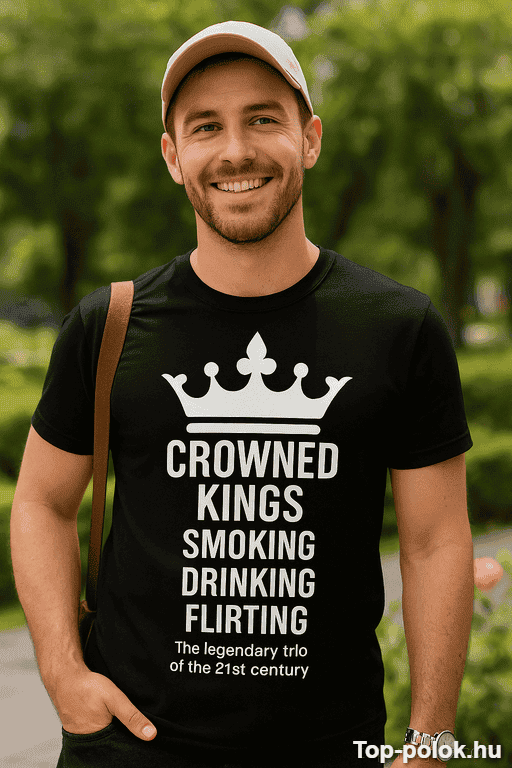 Van az a barát, kolléga vagy párod, aki egy poént sem hagy ki, és a buliban mindig ő az, akiről másnap is beszélnek. Ennek a pólónak a felirata pontosan ezt az energiát hozza: koronás „királyok”, füst, ital, flört – és az a pimasz mosoly, amit nem lehet nem észrevenni. 👑😏