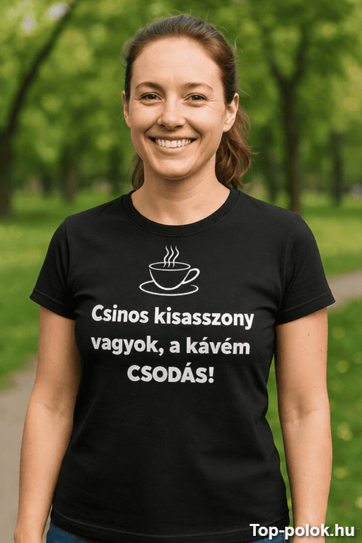 Ez a vicces póló kávé ajándék azoknak szól, akik kávé nélkül nem tárgyalnak, kávéval viszont bárkit levesznek a lábáról. A „Csinos kisasszony vagyok, a kávém csodás!” felirat egyszerre bók és figyelmeztetés: előbb korty, aztán csevej. ☕