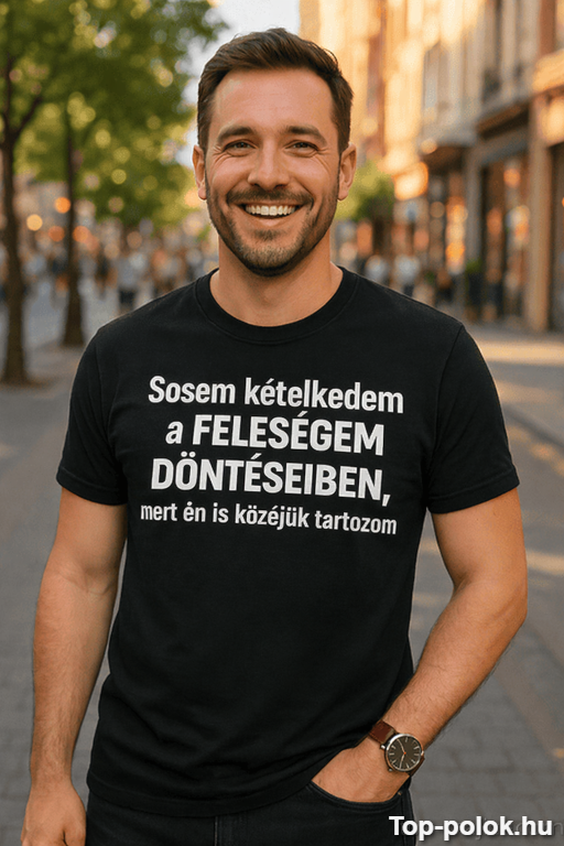 Vicces póló feleségem döntései – mert van az a mondat, ami egy pillanat alatt leveszi a feszültséget. A felirat garantáltan mosolyt csal a családi vacsorán és a haverok előtt is 😄