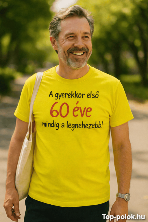 A „A gyerekkor első 60 éve mindig a legnehezebb!” felirat garantáltan beindítja a nevetést. Tökéletes, ha 60-nál is fiatalos maradt valaki… legalábbis fejben 😄