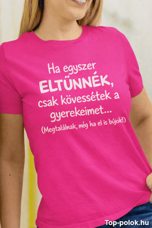 A „Ha egyszer eltűnnék, csak kövessétek a gyerekeimet… (Megtalálnak, még ha el is bújok!)” felirat pont az a csípős humor, amitől minden anyuka összekacsint a többi szülővel. Mert valljuk be: a gyerekek mellett a „láthatatlanság” csak legenda. 😅