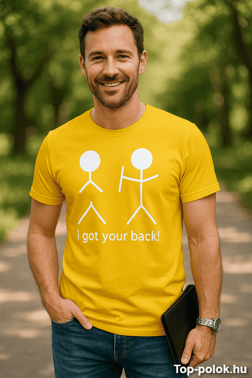 Ha olyan vicces póló ajándék kell, ami egyetlen mondattal elintézi a hangulatot, meg is van: „I got your back!” – és már látod is, ahogy a haverod, a párod vagy a kollégád vigyorogva magyarázza a poént. 😉