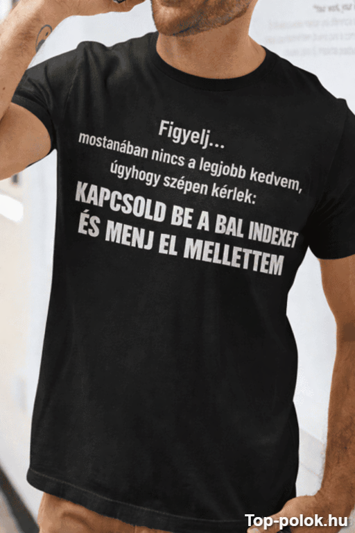 Ha kell egy egyértelmű, mégis vicces határhúzás, ez a vicces póló bal index poénnal telibe talál. A felirat („Figyelj… mostanában nincs a legjobb kedvem… Kapcsold be a bal indexet és menj el mellettem”) pont azt mondja ki, amit sokan csak gondolnak — és ettől lesz igazán ütős. 😏