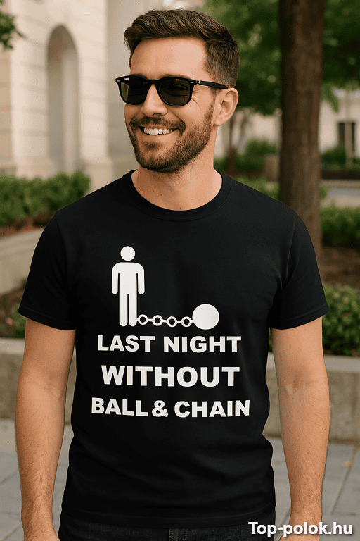 A „Last night without ball & chain” felirat az a finoman pimasz poén, amitől mindenki tudja: itt valaki kiszabadult egy estére. Tökéletes, ha egy vicces beszólással vinnéd el a show-t 😄