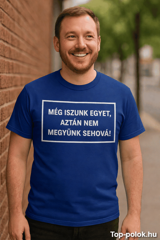 Van az a pillanat, amikor már mindenki indulna… aztán elhangzik a mágikus mondat: „Még iszunk egyet, aztán nem megyünk sehová!” Ez a poénos póló italos hangulattal azonnal feldobja a társaságot, és egyértelmű üzenetet küld: ma nem a korai hazamenetel napja van 🍻