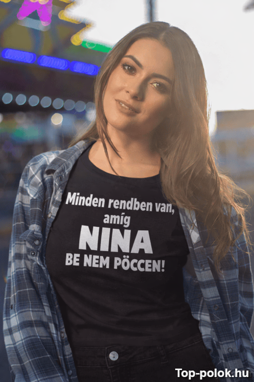 Ez a vicces póló Nina felirattal egyetlen mondattal elintézi a hangulatot: „Minden rendben van, amíg Nina be nem pöccen!” – és máris mindenki tudja, hogy jobb óvatosan viccelődni 😄