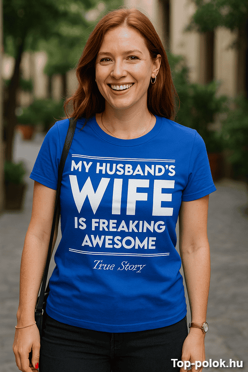 Ha olyan vicces póló ajándék kell, ami egyszerre pimasz, kedves és brutálisan önbizalom-növelő, ez a darab telitalálat. A „My husband’s wife is freaking awesome true story” üzenet olyan, mintha a férj narrálná a valóságot – te pedig csak aratsz. 😄