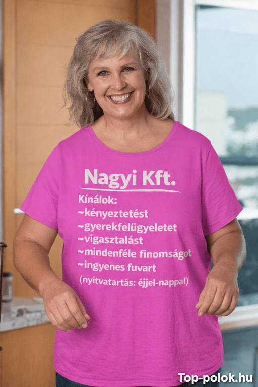 Ha olyan vicces póló nagymamának ajándék ötletet keresel, amin mindenki azonnal nevet, a „Nagyi Kft.” telitalálat. A felirat pont úgy hangzik, mint egy családi szolgáltató központ: kényeztetés, gyerekfelügyelet, vigasztalás, mindenféle finomság és még „ingyenes fuvar” is – ráadásul éjjel-nappal. 😄