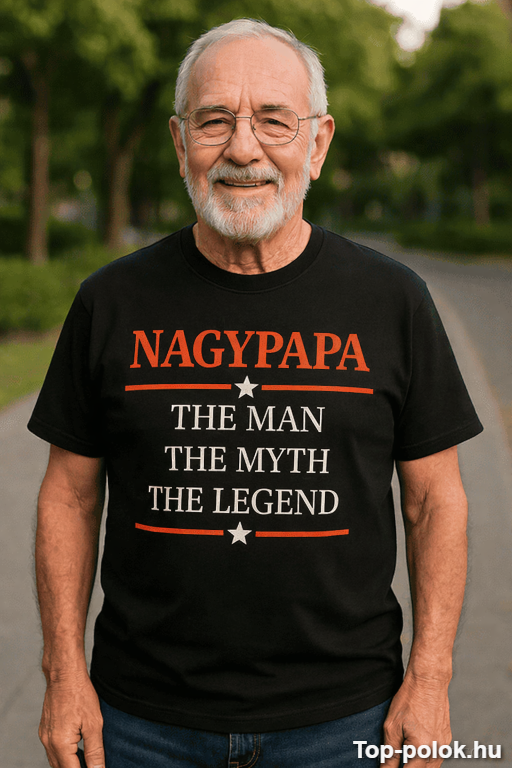 Ha olyan vicces póló nagypapa ajándék kell, ami nem csak „aranyos”, hanem tényleg üt, akkor ez telitalálat. A „Nagypapa the man the myth the legend” felirat egyértelmű üzenet: itt a család ikonja lépett színre. 👑